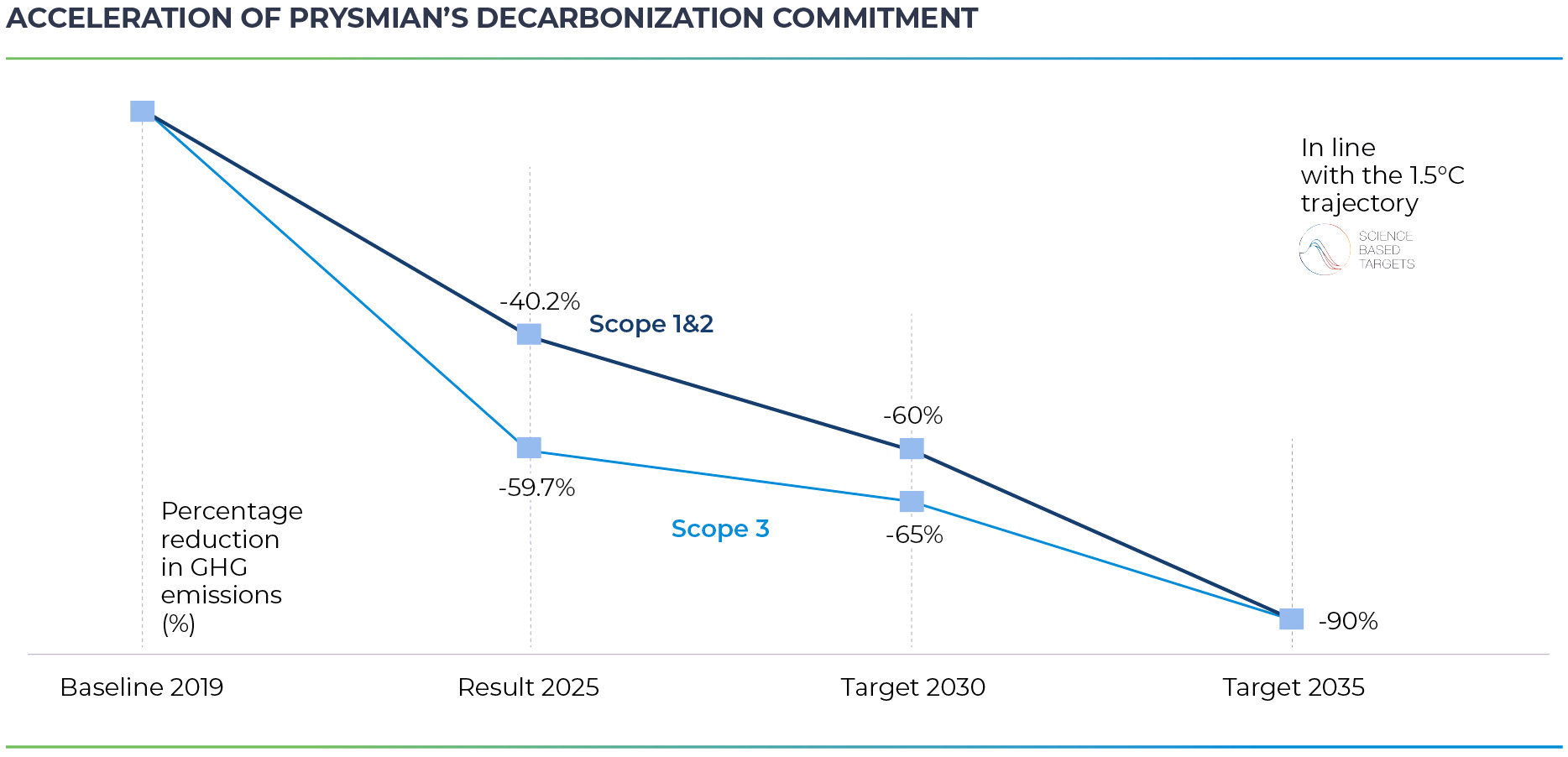 Prysmian’s climate strategy uses science-based targets, aligned with the goals in the Paris Agreement and validated by the Science-based Target initiative. The company has set itself the goal of achieving Net Zero for Scope 1, 2 and 3 emissions by 2035. Presented during the Capital Markets Day held in New York in 2025, the strategy embeds sustainability within the “Accelerating Growth” strategic plan, combining decarbonization, technological innovation and collaboration with suppliers and partners. Our Climate Ambition also includes avoided emissions, thanks to solutions such as Transmission infrastructure for the energy transition, the E3X robot, Sirocco Extreme fiber and digital predictive maintenance systems such as PryID, Alesea, All-Ground, EOSS and Elaspeed S.
