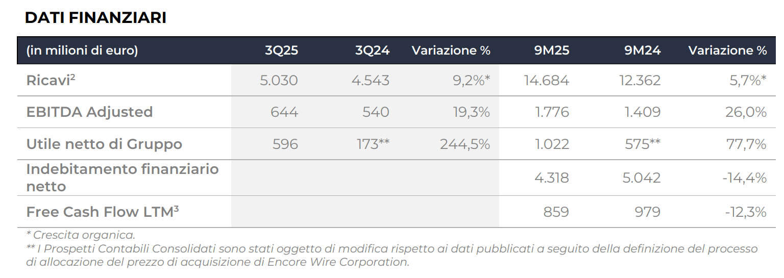 I ricavi riflettono l'inclusione nel perimetro di Encore Wire, completamente consolidata a partire dal 1° luglio 2024, e di Channell, consolidata a partire dal 1° giugno 2025.
