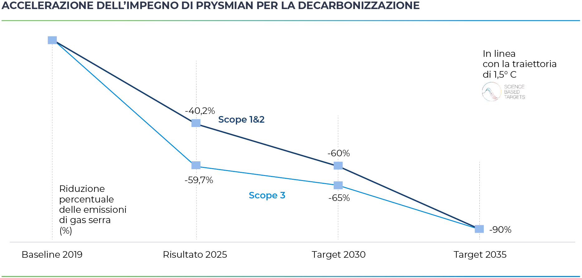 La strategia climatica di Prysmian adotta target science based, allineati agli obiettivi dell’Accordo di Parigi e validati dalla Science-based Target initiative. L’azienda ha dichiarato l’obiettivo di raggiungere il Net Zero su Scope 1, 2 e 3 entro il 2035. Presentata al Capital Markets Day di New York 2025, la strategia integra sostenibilità e piano industriale “Accelerating Growth”, combinando decarbonizzazione, innovazione tecnologica e collaborazione con fornitori e partner. La Climate Ambition include anche le emissioni evitate, grazie a soluzioni come le infrastrutture di Transmission per la transizione energetica, il robot E3X, le reti ottiche Sirocco Extreme e i sistemi digitali di manutenzione predittiva PryID, Alesea, All-Ground, EOSS ed Elaspeed S.